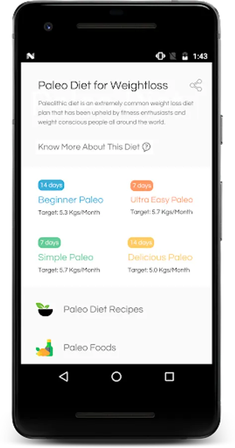 This Paleo Diet App gives a complete breakdown of the foods that you can eat for each meal for all the dieting days right from breakfast, lunch, and dinner to snacks. The app has been segregated into 4 basic parts for the comfort level of the dieter - Beginners, Simple, Delicious and Ultra Easy Paleo diets and delicious recipes.