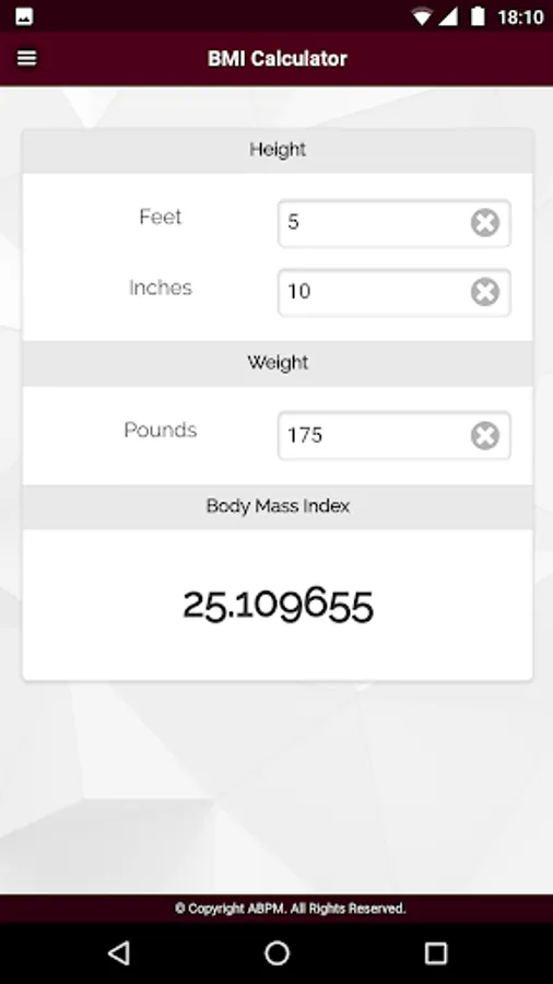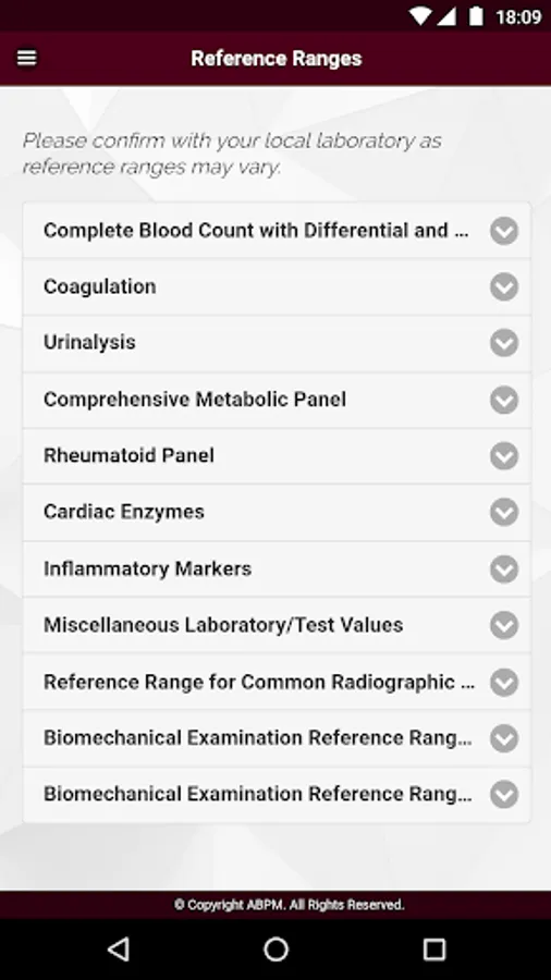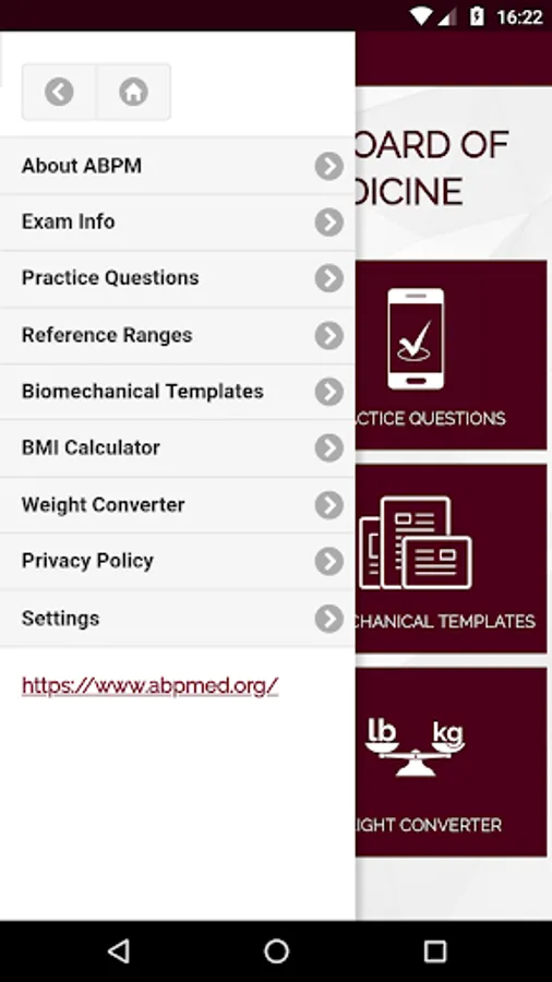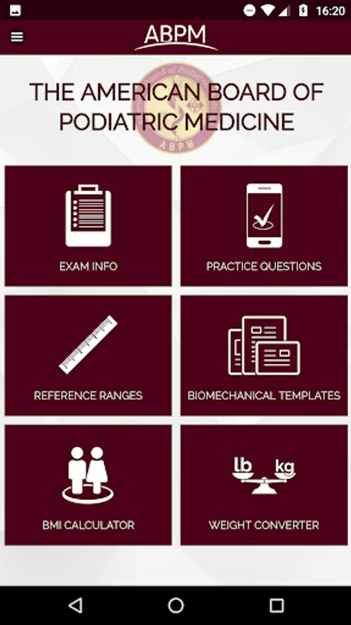 The ABPM App accompanies the website www.abpmed.org. It features information about ABPM and examinations, examination practice questions, reference ranges, biomechanical examination templates, a body mass index (BMI) calculator, a weight conversion calculator, and can receive optional notifications regarding news and events.
