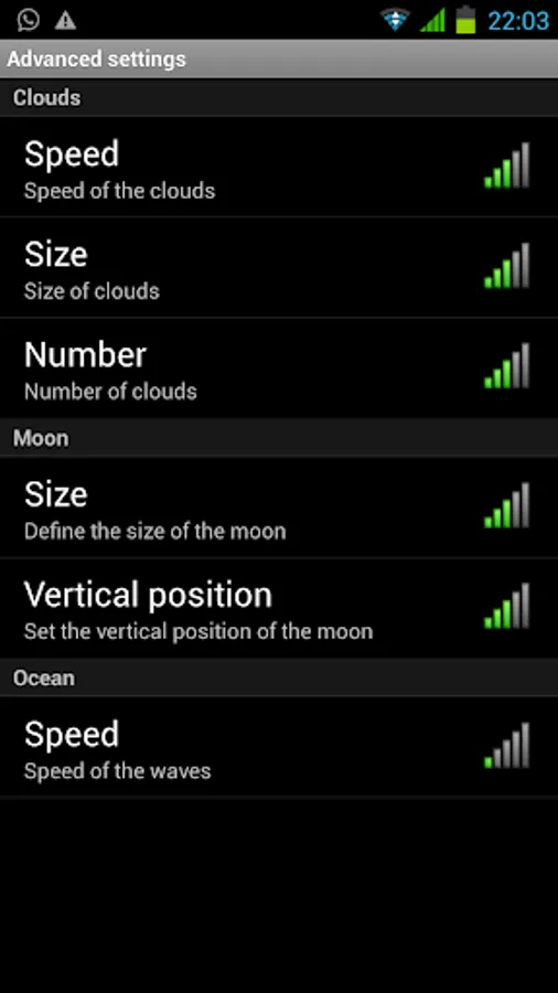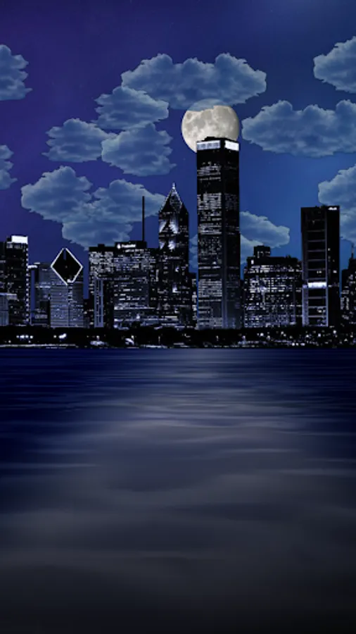 Look at the city from the sea. You will see waves moving along to sea. Moon, clouds and other objects are present on the night sky. The unlocked version of this live wallpaper give you the capability to select cityscape you prefer. Moreover you will be able to customize the size and the position of the moon, the clouds and other parameters.