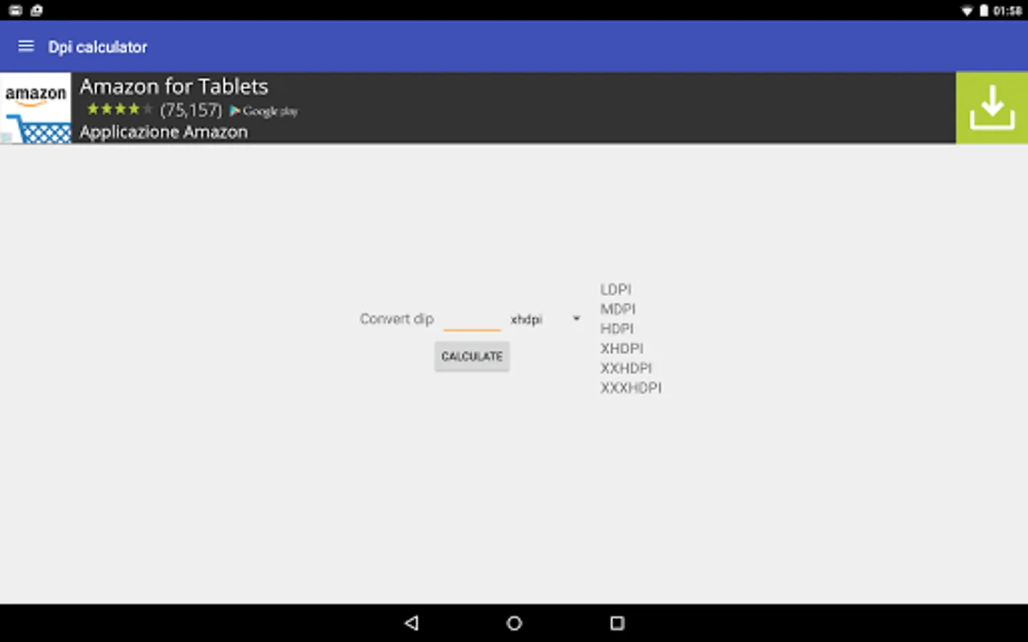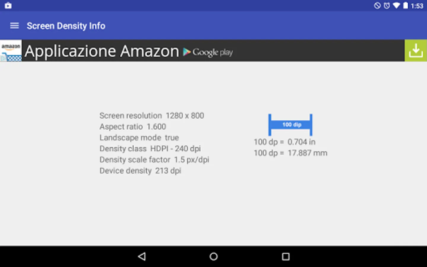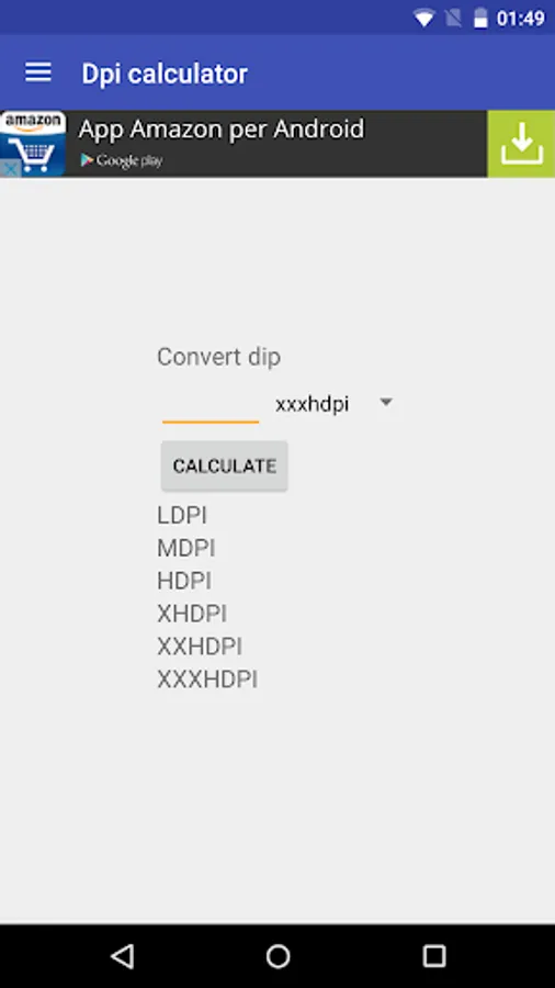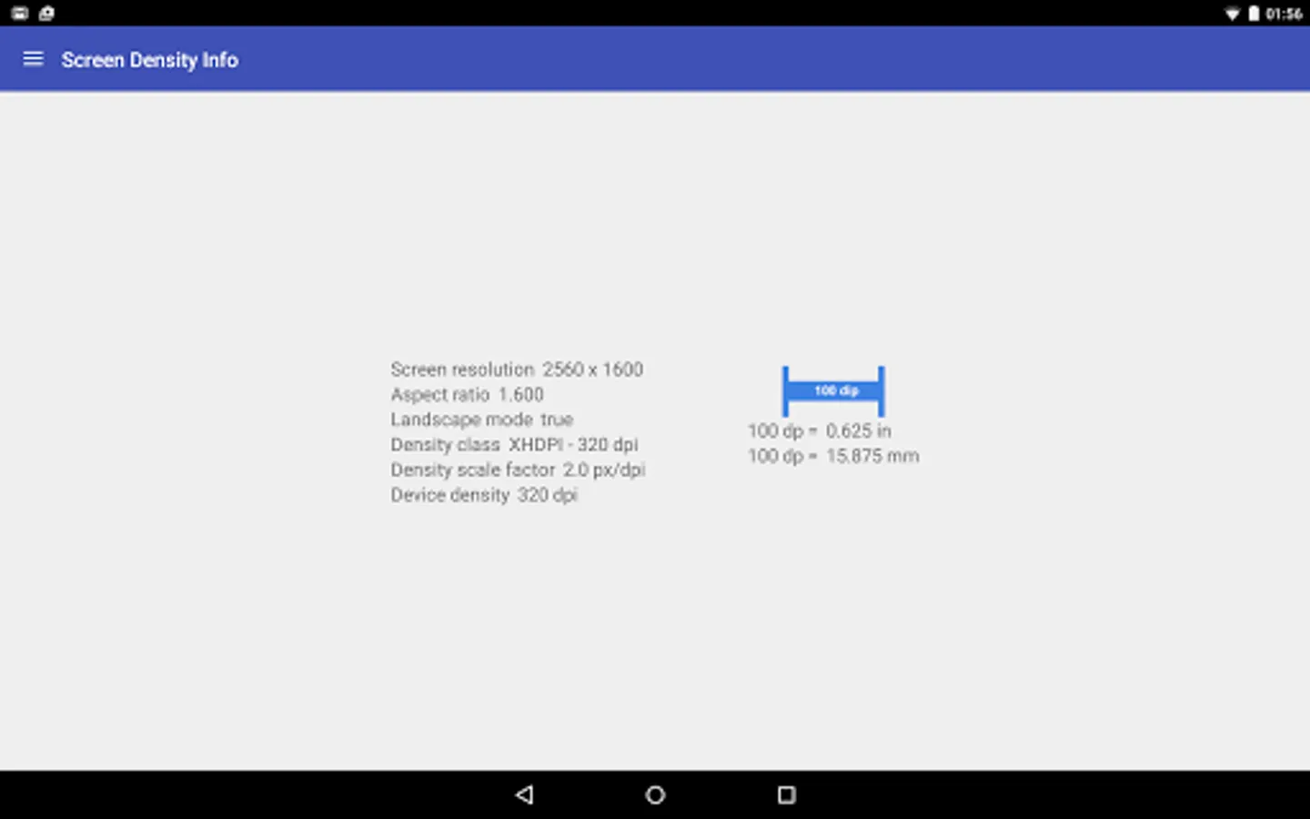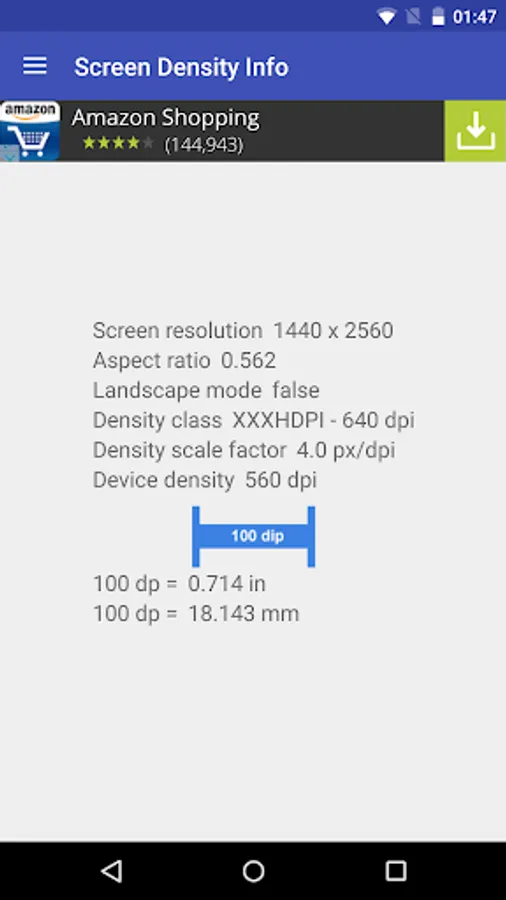 This tool is usefull to display informations about screen resolution and on density for devices. It will able to display the screen resolution, the aspect ratio of screen, if screen is in landscape mode, the density class (ldpi, mdpi, hdpi, xhdpi, xxhdpi, xxxhdpi), the scale factor and the device screen density. There is a image large 100dip. I put it just to display conversion between dp and inc and conversion between dp and mm.