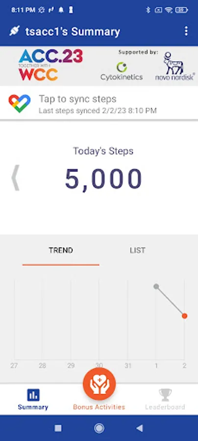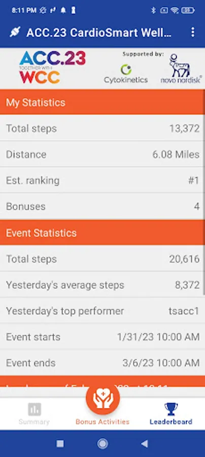 This app is for use in the ACC.23/WCC CardioSmart Wellness Challenge supported by Cytokinetics and Novo Nordisk. The Challenge will be held during the ACC.23 Together With WCC conference on March 4-6, 2023 in New Orleans. The ACC.23 Wellness Challenge encourages participants to walk and engage in some friendly competition with peers. Anyone can track their steps using their Android smartphone by pairing with the Google Fit app or by importing step data from their Fitbit or Garmin activity trackers.