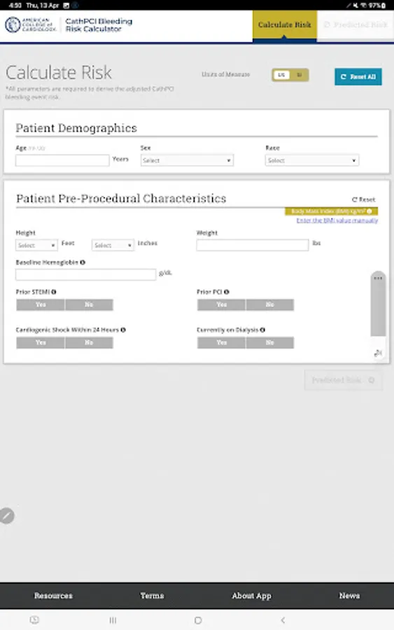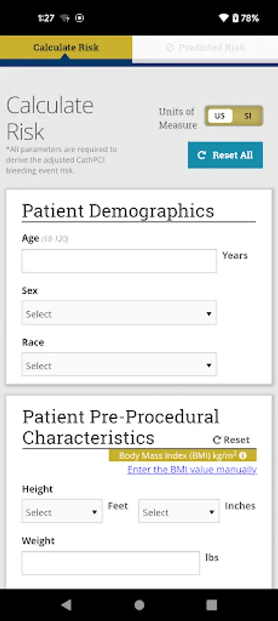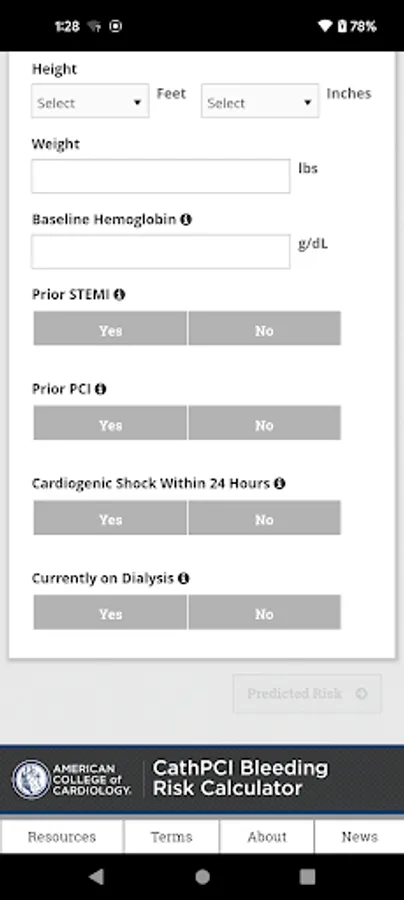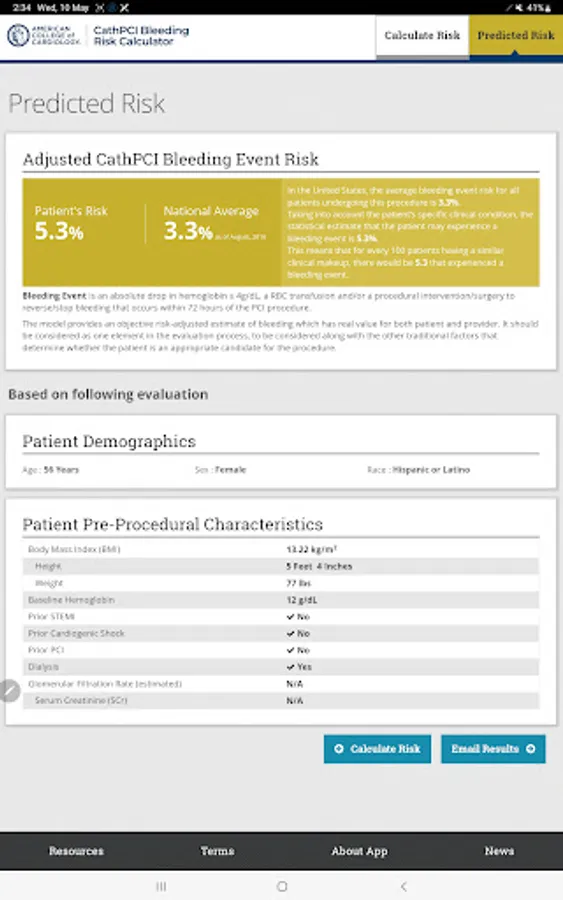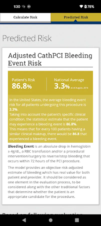 The ACC CathPCI Bleeding Risk Calculator App helps clinicians assess the individualized patient risk of experiencing a bleeding event associated with a PCI procedure. Clinicians can compare individual patient risk to the national average based on data from the CathPCI Registry®. The app facilitates consistent risk assessment and communication between a clinician and patient about the overall PCI procedure.