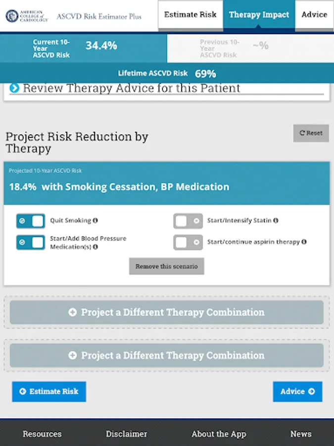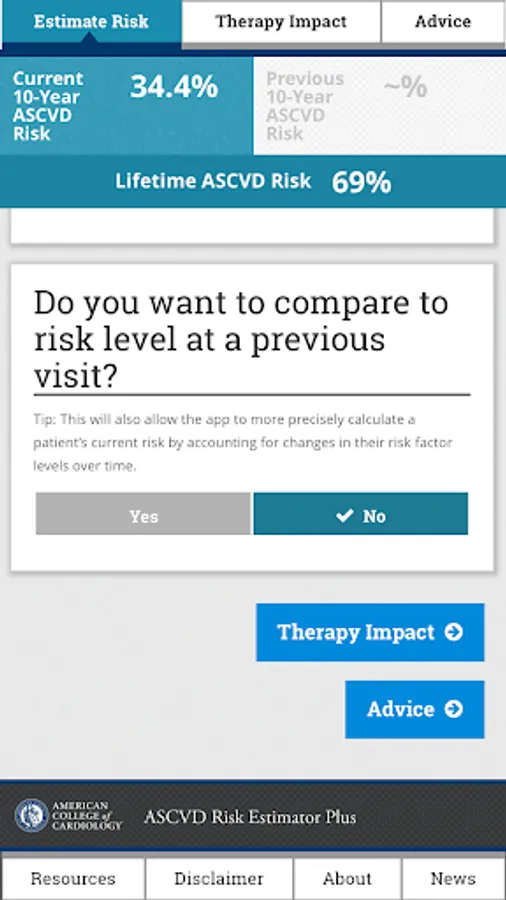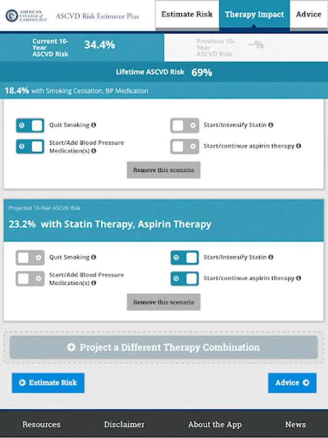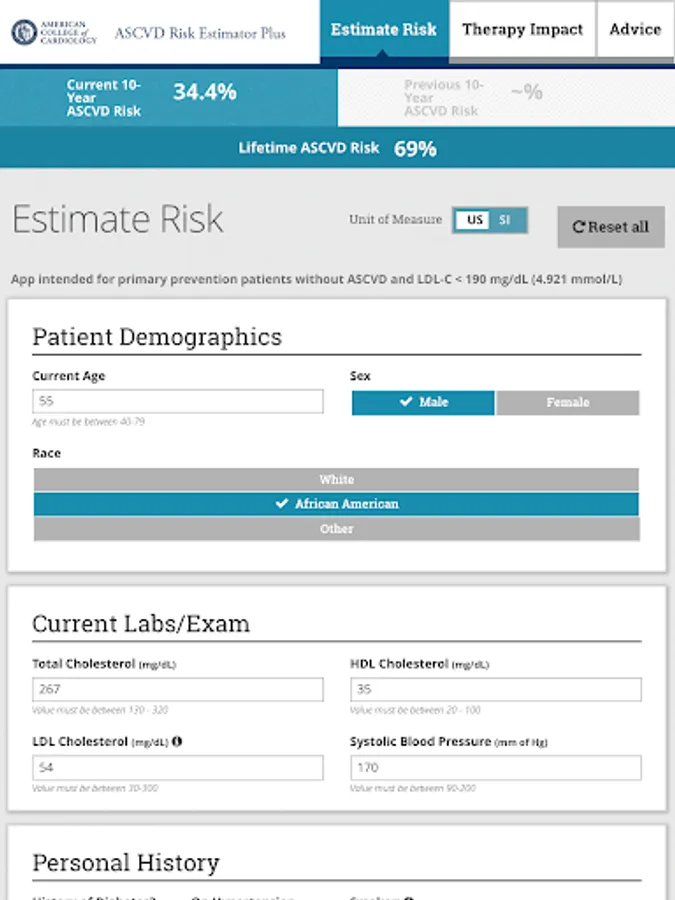 Advice from the app is derived from the 2019 ACC/AHA Guideline on the Primary Prevention of Cardiovascular Disease, the 2018 ACC/AHA et.al Guideline on the Management of Blood Cholesterol, the 2017 ACC/AHA et.al Guideline on High Blood Pressure in Adults, the 2013 ACC/AHA Guideline on the Assessment of Cardiovascular Risk, and the 2016 Million Hearts Longitudinal ASCVD Risk Assessment Tool user guide. The information and recommendations in this app are meant to support clinical decision making. They are not meant to represent the only or best course of care, or replace clinical judgment. Therapeutic options should be determined after discussion between the patient and their care provider.