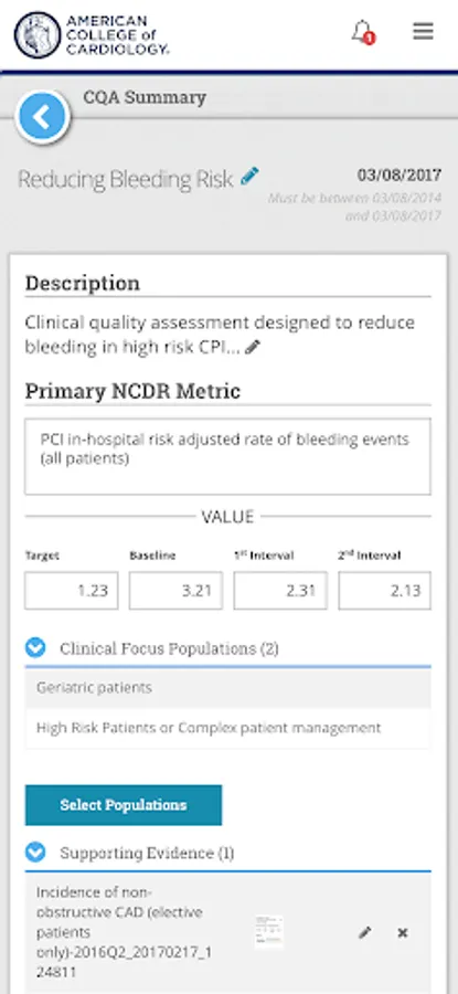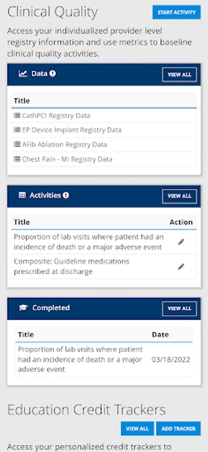 • Ability to create, track progress, and document implementation of self-guided clinical quality activities based on NCDR data.