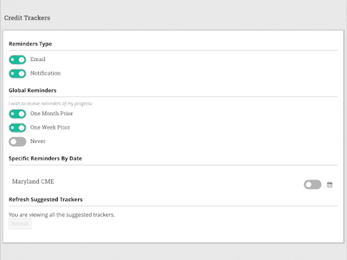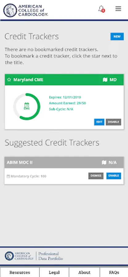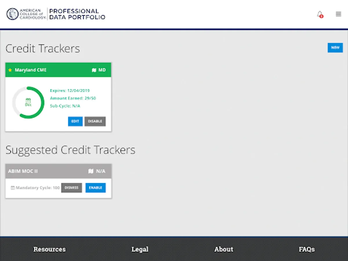 Continuing education is tracked through credit trackers. Using a member’s ACC transcript, the tracker will plot the credits/points earned against a clinicians certification and licensure requirements.