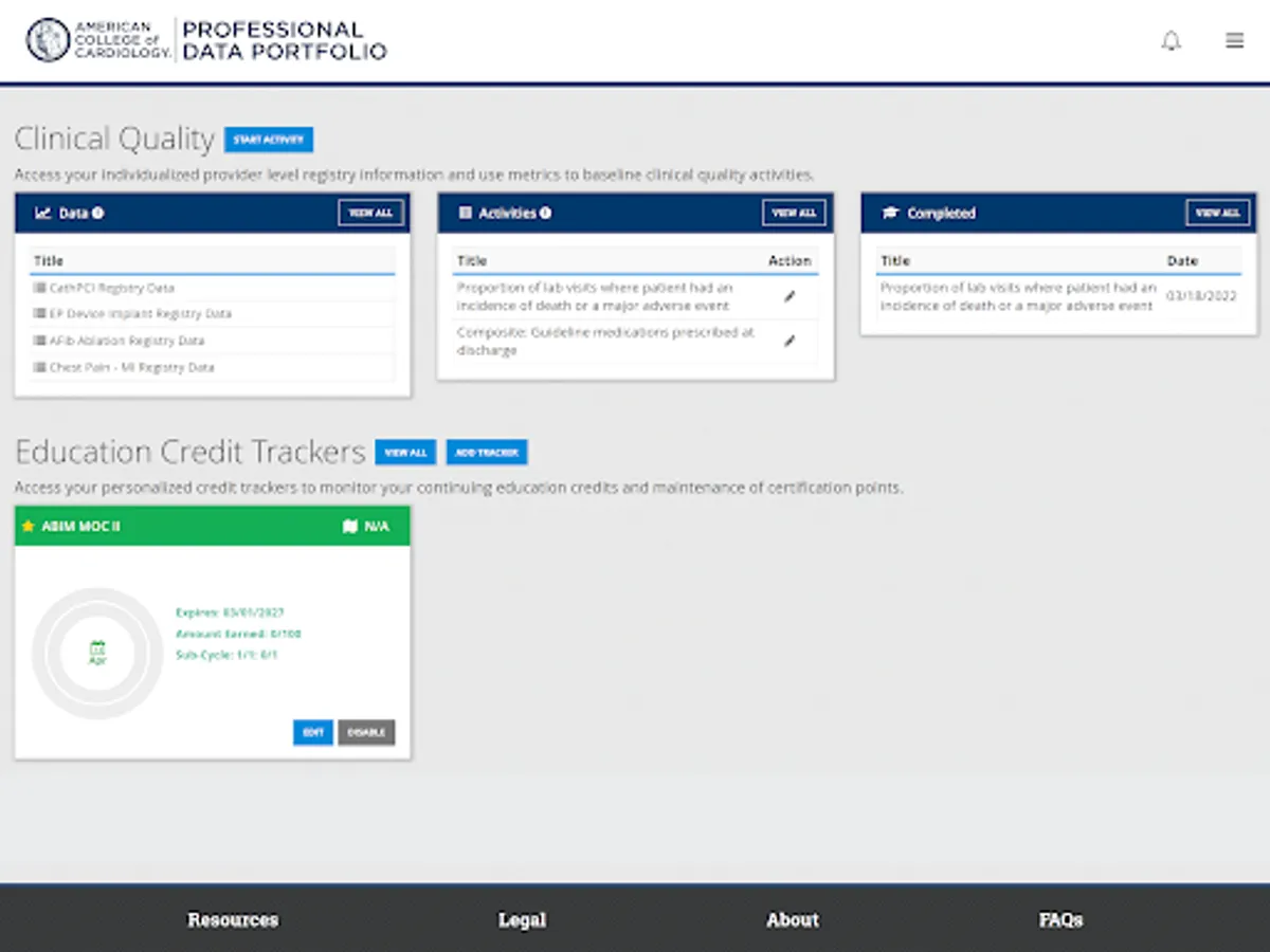 The Professional Data Portfolio helps physicians track their clinical performance data and continuing education needed for maintenance of certification and licensure.