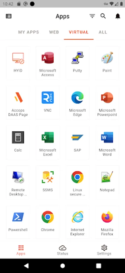 Virtual Desktop Access: Access virtual desktops hosted through Accops HyWorks, including RDS-based desktops and full Windows 7+ OS-based desktops.