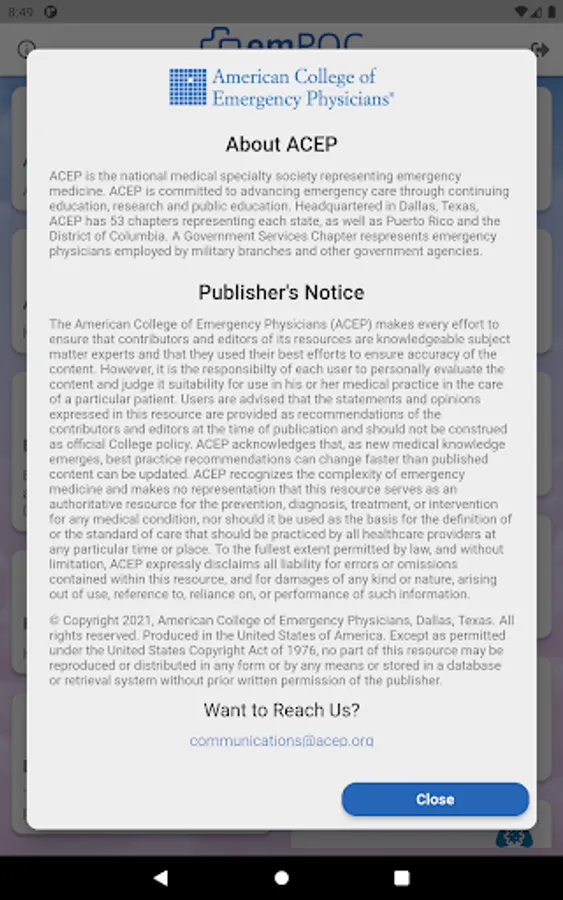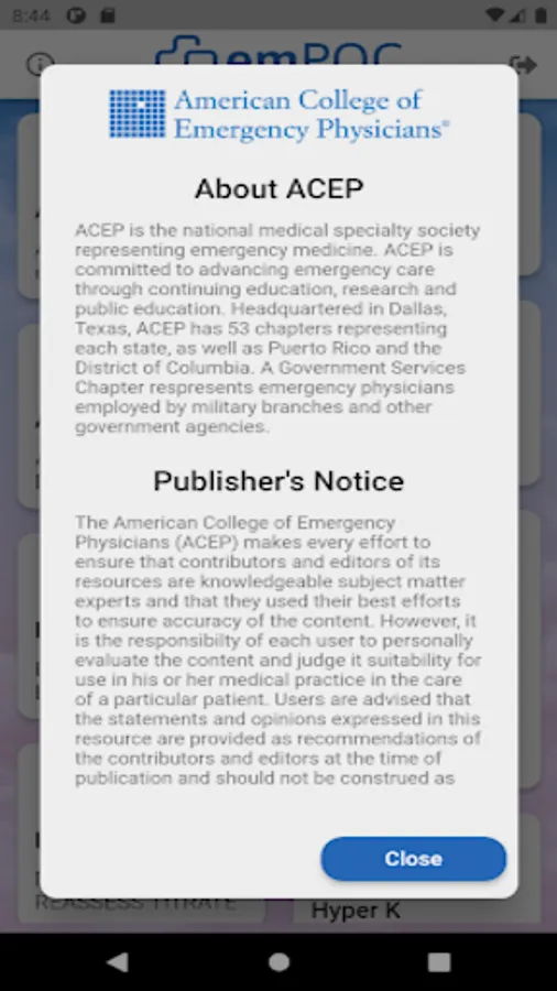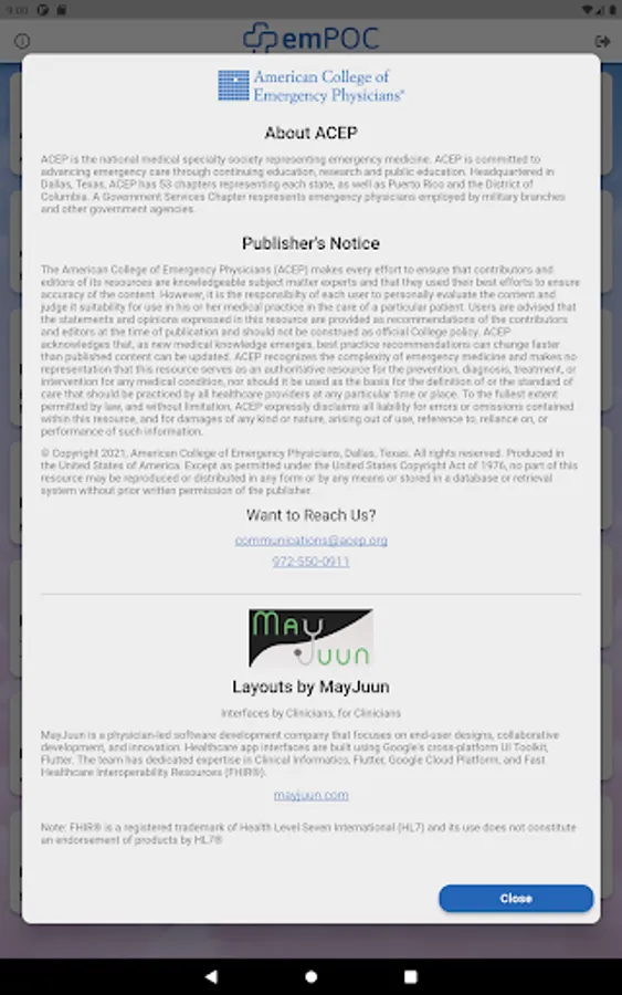 The American College of Emergency Physicians’ point of care app, emPOC, is transforming care at the bedside. The app provides clinical content and tools for physicians to utilize when caring for patients in the emergency department. We have recruited top experts in the field to develop tools we know our members can trust. This app is included as an exclusive ACEP member benefit.