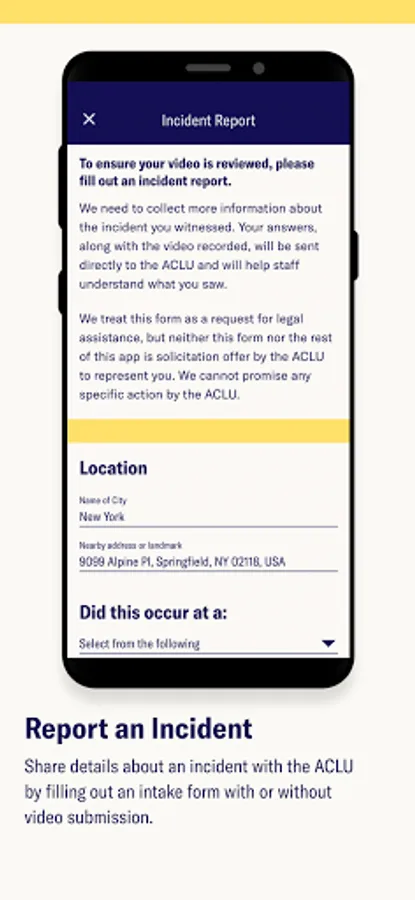 • Record and submit incidents directly and securely to your local ACLU using your phone camera.
