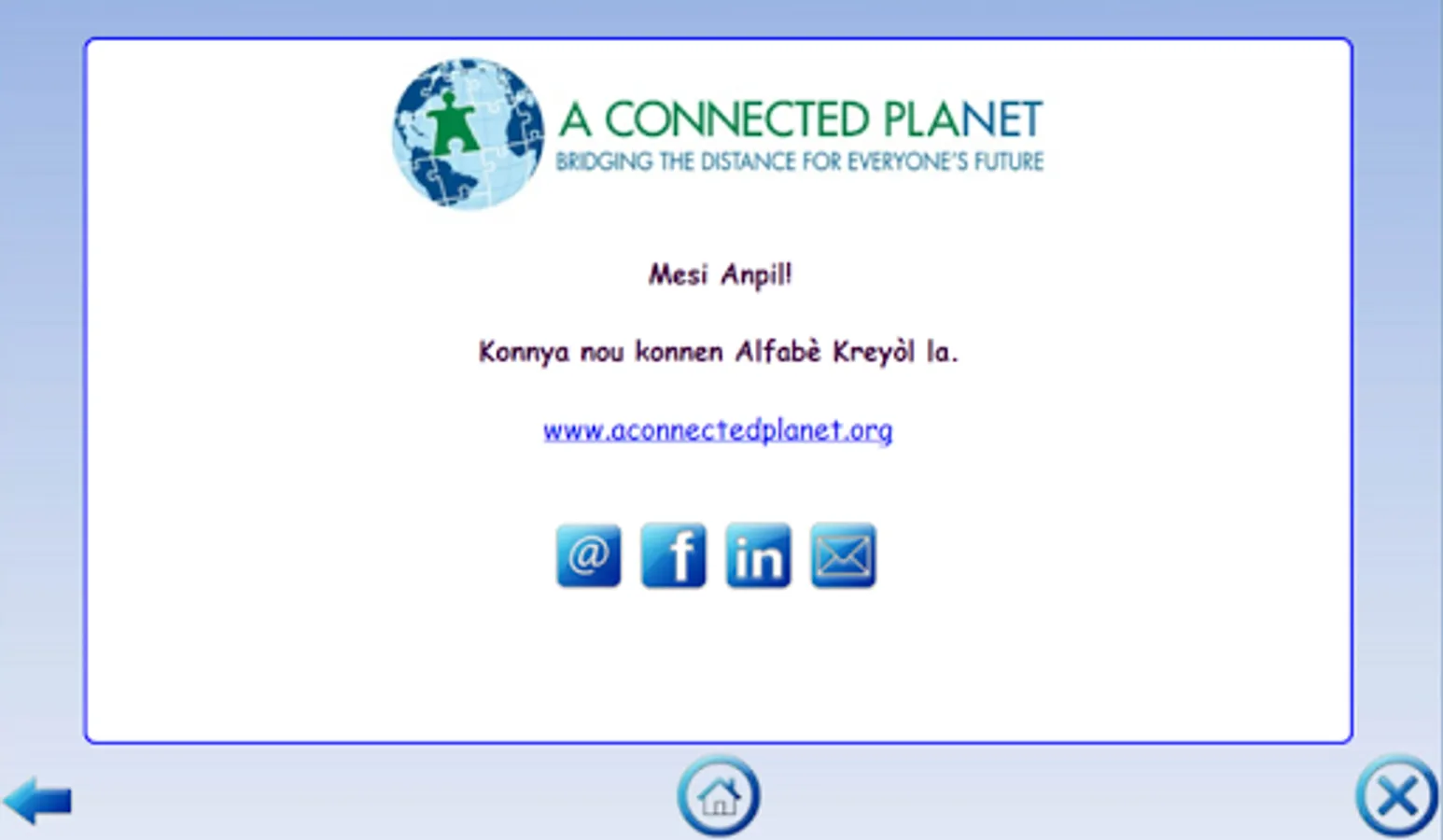 Alfabè Kreyòl was developed by A Connected Planet (ACP) Foundation for use in Haiti in ACP's Tablet Implementation Program. Virtually no applications exist in Haitian Creole. So ACP started building its own applications.