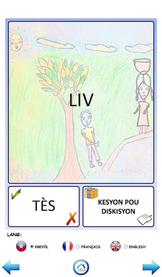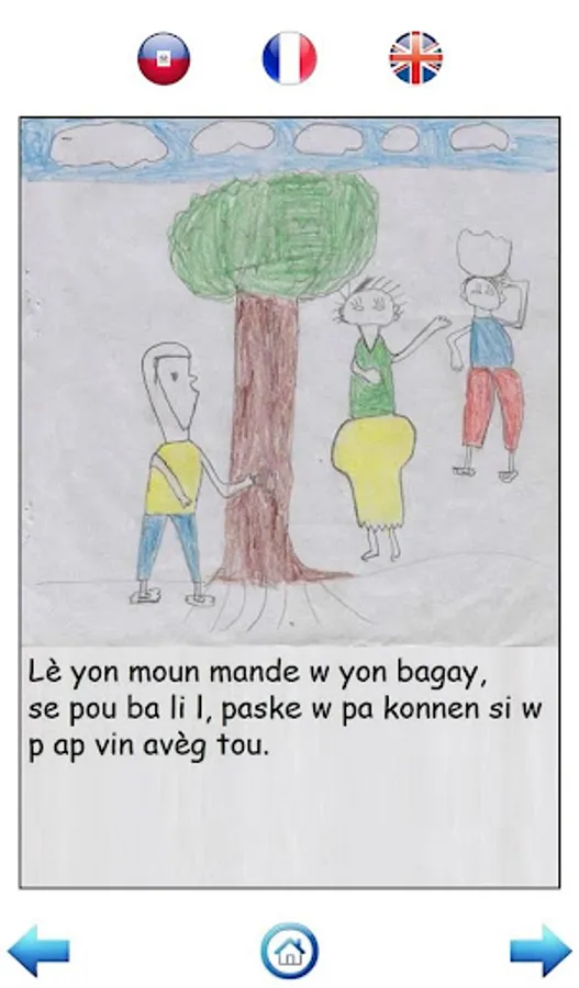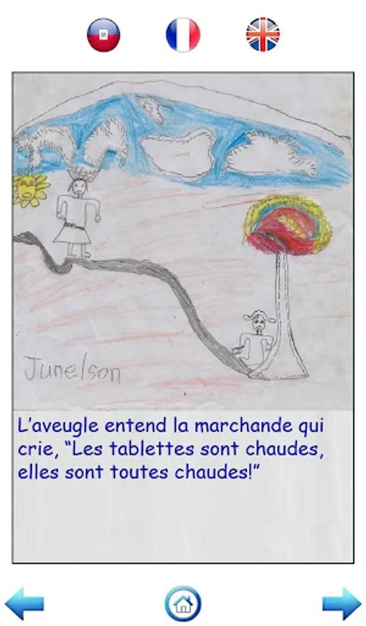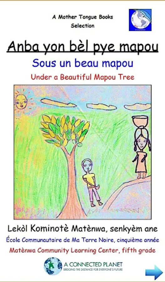 Anba yon Bèl Pye Mapou was originally written in Haitian Creole and has been translated into French and English. Audio in all three languages is provided in the application. The Matènwa Community Learning Center provided the Haitian Creole recordings for the application.