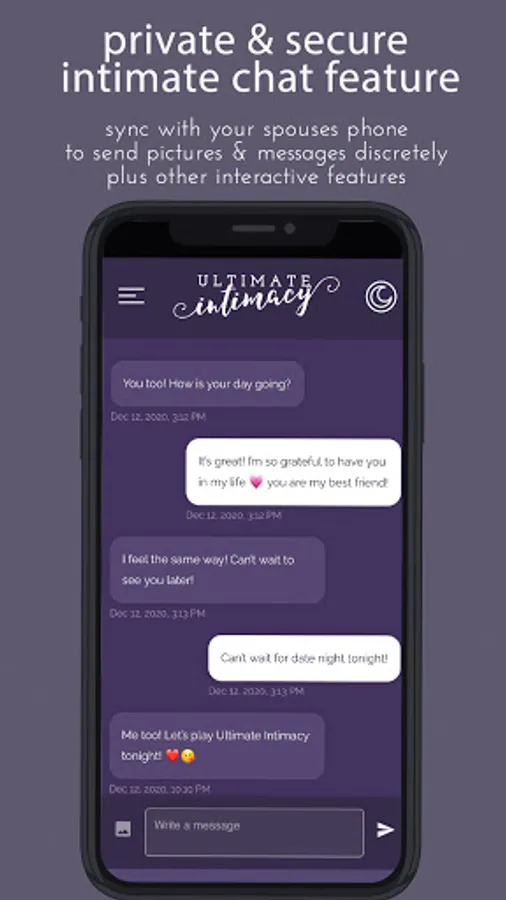 * Safe and secure in app private chat messaging system where you and your spouse can communicate intimately together and send pictures and messages.