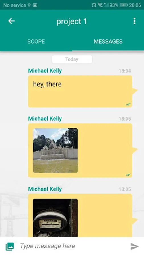 Each project contains a chat messaging screen where app users can post messages and photos relating to the project.
