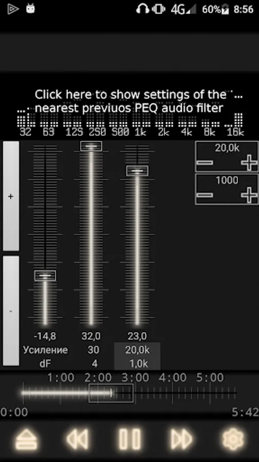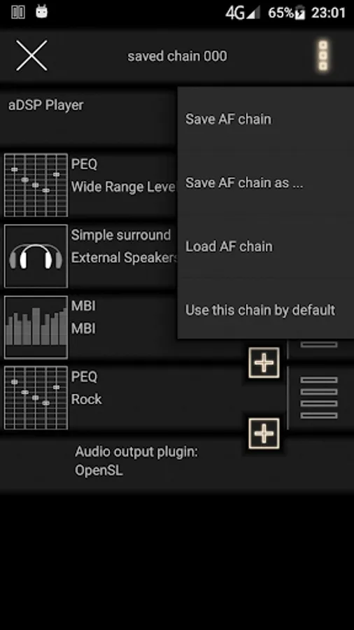 1. (PEQ) Parametric EQ (you can add or remove band and set the frequency and bandwidth). You can load settings for added filters (It can be done from the menu that opens by long click on the filter in the list).