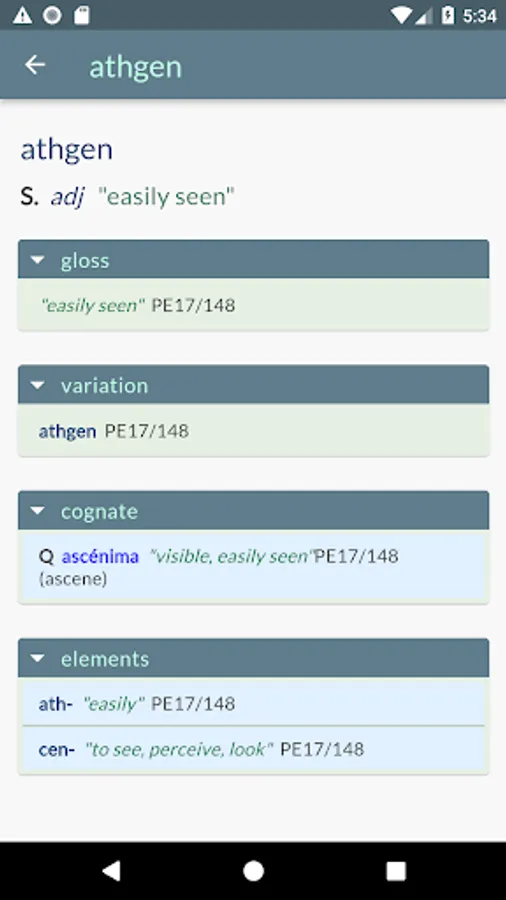 - tapping a word opens a detail screen with glosses, examples, inflections, changes, cognates, elements, related words, variations and notes (when available)