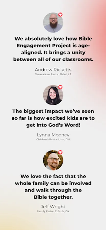 Bible Engagement Project equips churches with free curriculum for Preschool, Kids, Youth, and Adults that transforms lives and anchors people in the Bible.