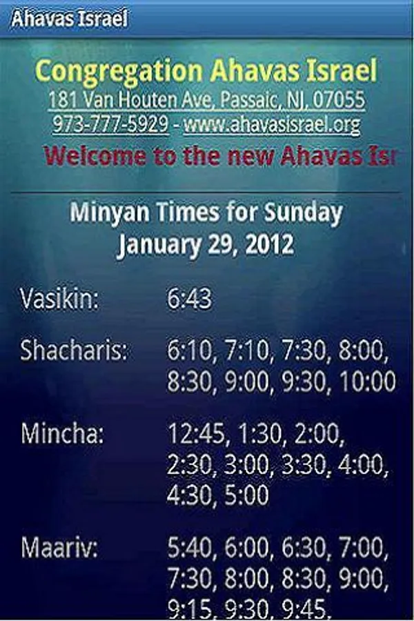 This app will display all minyanim times for the next seven days, provide you with shul location and contact information, as well as the occasional shul announcement. Comments welcome! (Comments on the app can also be made via the shul website)