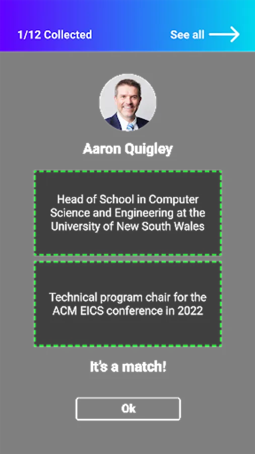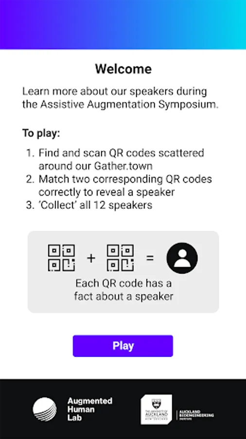 This is an event-related game created for AHLab Symposium 2021, which is to be held on 24th Sep 2021. There are 24 QR codes all around the AHLab gather town. Participants can go around the virtual rooms and find those QR codes. Each of these QR codes contains a fact about an event speaker. There are two facts/QR codes for each speaker. The goal is to find and scan matching pairs, so the related speaker will be added to your collection. Once collected all 12 speakers, congratulations, you have discovered all of them. It's possible to go to the speaker gallery and tap on a speaker to see the collected facts.