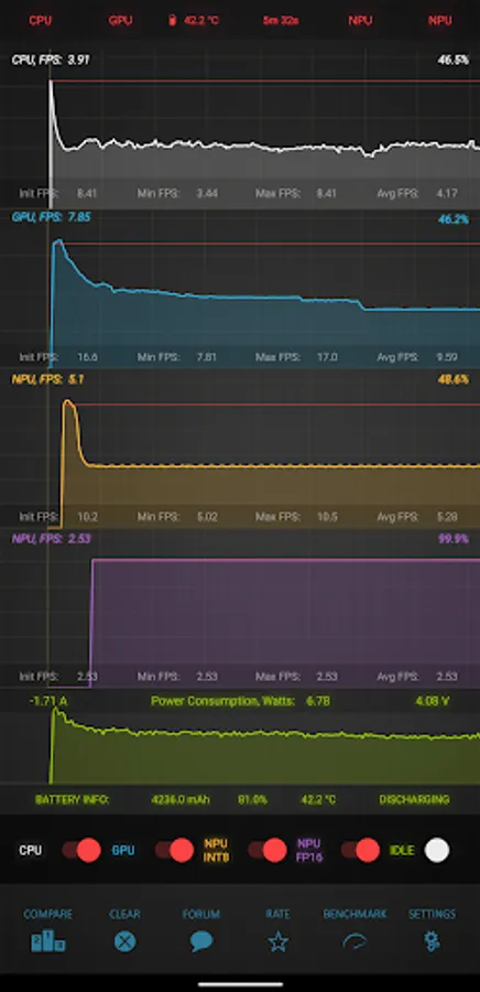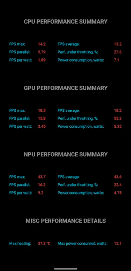 - CPU, GPU and NPU computational performance (FPS)