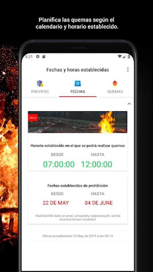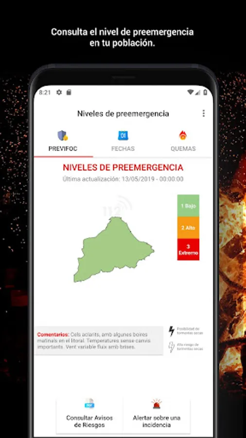 Thanks to the direct connection with Previfoc , the user will be able to see from the application the current pre-emergency level of the population, preventing the activation of burns when there is a high or extreme level.