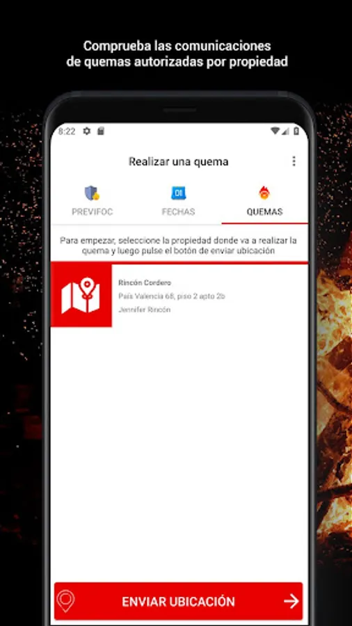 Control Foc is a mobile application designed for users who request agricultural-type burning authorizations, notifying burning activity in real time. Through the application, users will be able to check the times and dates allowed for carrying out burns in the towns where authorization has been requested.