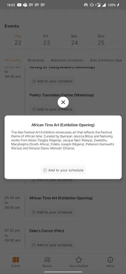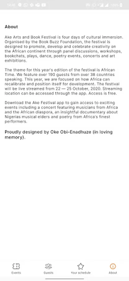 The theme for this year's edition of the festival is African Time. We feature over 190 guests from over 38 countries speaking. This year, we are focused on how Africa can recalibrate and position itself for development. The festival will be live streamed from 22 — 25 October, 2020. Streaming location can be accessed through the app. Access is free.