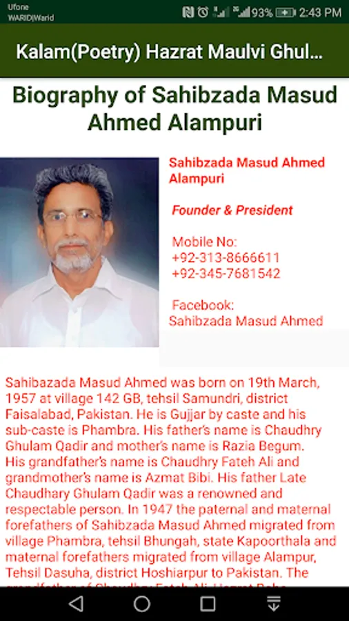 Sahibazada Masud Ahmed was born on 19th March, 1957 at village 142 GB, tehsil Samundri, district Faisalabad, Pakistan. He is Gujjar by caste and his sub-caste is Phambra. His father’s name is Chaudhry Ghulam Qadir and mother’s name is Razia Begum. His grandfather’s name is Chaudhry Fateh Ali and grandmother’s name is Azmat Bibi. His father Late Chaudhary Ghulam Qadir was a renowned and respectable person. In 1947 the paternal and maternal forefathers of Sahibzada Masud Ahmed migrated from village Phambra, tehsil Bhungah, state Kapoorthala and maternal forefathers migrated from village Alampur, Tehsil Dasuha, district Hoshiarpur to Pakistan. The grandfather of Chaudhry Fateh Ali, Hazrat Baba Khawaja was a highly designated government official in Maharaja’s cabinet in state Kapoorthala,india. Sahibzada Masud Ahmed is a maternal grandson of great sufi poet Hazrat Moulvi Ghulam Rasool Alampuri. Sahibzada Masud Ahmed has one daughter, two sons and one maternal granddaughter at this time. The eldest daughter’s name is Sidra Masud and the son’s names are Ali Anwar Qadir and Muhammad Hammad Masud. His maternal grand daughter’s name is Atika Zainab.