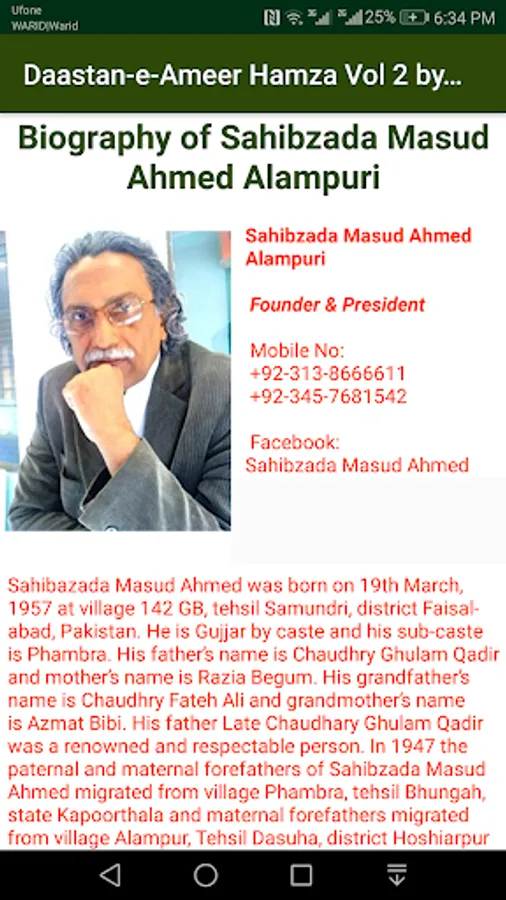 Sahibazada Masud Ahmed was born on 19th March, 1957 at village 142 GB, tehsil Samundri, district Faisalabad, Pakistan. He is Gujjar by caste and his sub-caste is Phambra. His father’s name is Chaudhry Ghulam Qadir and mother’s name is Razia Begum. His grandfather’s name is Chaudhry Fateh Ali and grandmother’s name is Azmat Bibi. His father Late Chaudhary Ghulam Qadir was a renowned and respectable person. In 1947 the paternal and maternal forefathers of Sahibzada Masud Ahmed migrated from village Phambra, tehsil Bhungah, state Kapoorthala and maternal forefathers migrated from village Alampur, Tehsil Dasuha, district Hoshiarpur to Pakistan. The grandfather of Chaudhry Fateh Ali, Hazrat Baba Sahibzada Masud Ahmed is a maternal grandson of great sufi poet Hazrat Moulvi Ghulam Rasool Alampuri. Sahibzada Masud Ahmed has one daughter, two sons and one maternal granddaughter at this time. The eldest daughter’s name is Sidra Masud and the son’s names are Ali Anwar Qadir and Muhammad Hammad Masud. His maternal grand daughter’s name is Atika Zainab.Khawaja was a highly designated government official in Maharaja’s cabinet in state Kapoorthala,india.