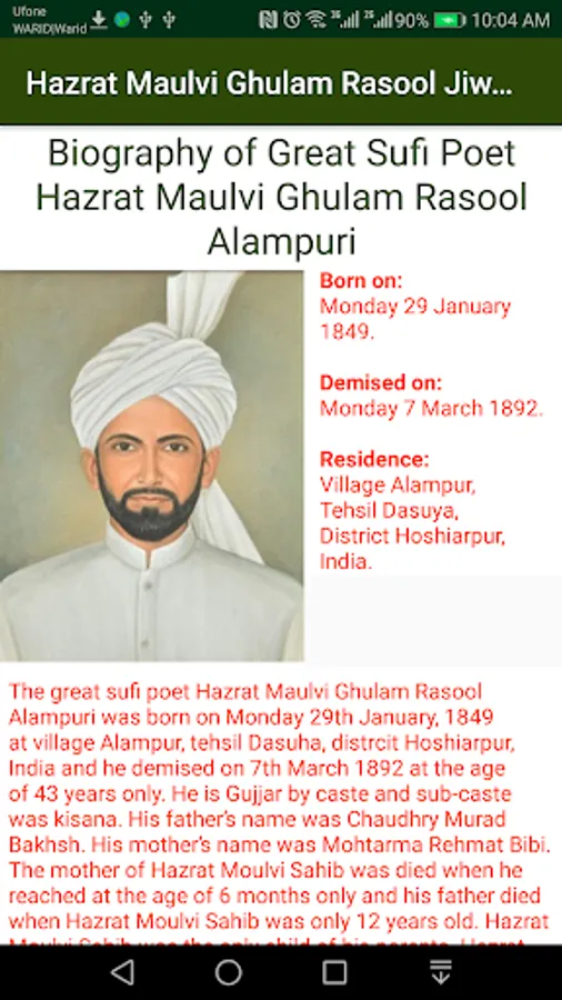 The great Sufi poet Hazrat Maulvi Ghulam Rasool Alampuri was born on Monday 29th January 1849 at village Alampur, tehsil Dasuha, district Hoshiarpur, India and he demised on 7th March 1892 at the age of 43 years only.He is Gujjar by caste and sub-caste was kisana. His father’s name was Chaudhry Murad Bakhsh. His mother’s name was Mohtarma Rehmat Bibi. The mother of Hazrat Maulvi Sahib has died when he reached at the age of 6 months only and his father died when Hazrat Moulvi Sahib was only 12 years old. Hazrat Maulvi Sahib was the only child of his parents. Hazrat Maulvi Sahib got married thrice. He had two daughters, Ayesha Bibi and Khadija Bibi. Sahibzada Masud Ahmed is a son of Razia Begum who is the maternal daughter of Hazrat Maulvi Sahib and Sahibzada Masud Ahmed is a maternal grandson of Hazrat Maulvi Sahib. He played a historical role and laid the foundation of Hazrat Maulvi Ghulam Rasool Alampuri Trust on Friday 30 November 1990. Two books of Sahibzada Masud Ahmed were published on life history and work of Hazrat Maulvi Sahib. The first book with the title of “Doonghey Raaz” (A study regarding Moulvi Ghulam Rasool Alampuri) was published in 1999. The book is included in the course of M.A level in Pakistan.His second book with the title of “Moulvi Ghulam Rasool Alampuri: Personality and Work” has published by the “Pakistan Academy of Letters” in 2011. The book named “Moulvi Ghulam Rasool Alampuri: Personality & Works” and the same was translated into Gurmukhi script by the “Language & Literature Department” Patiala, India and published it.The work of Hazrat Maulvi Ghulam Rasool Alampuri has also been included in the curriculum from matriculation to MA level in Pakistan. Two PhDs have also been completed on him. His available books are Daastan Ameer Hamza, Rooh ul Tarteel, Ahsan ul Qasas, Masla e Tauheed, Seeh Harfi Hulya Sharif (P.B.U.H), Chithian, Seeh Harfi Sassi Punnu, Chopat Nama, Pandh Nama and Maa’rb ul Khashien.
