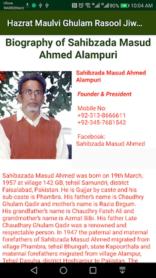 Sahibazada Masud Ahmed was born on 19th March, 1957 at village 142 GB, tehsil Samundri, district Faisalabad, Pakistan. He is Gujjar by caste and his sub-caste is Phambra. His father’s name is Chaudhry Ghulam Qadir and mother’s name is Razia Begum. His grandfather’s name is Chaudhry Fateh Ali and grandmother’s name is Azmat Bibi. His father Late Chaudhary Ghulam Qadir was a renowned and respectable person. In 1947 the paternal and maternal forefathers of Sahibzada Masud Ahmed migrated from village Phambra, tehsil Bhungah, state Kapoorthala and maternal forefathers migrated from village Alampur, Tehsil Dasuha, district Hoshiarpur to Pakistan. The grandfather of Chaudhry Fateh Ali, Hazrat Baba Khawaja was a highly designated government official in Maharaja’s cabinet in state Kapoorthala,india. Sahibzada Masud Ahmed is a maternal grandson of great sufi poet Hazrat Moulvi Ghulam Rasool Alampuri. Sahibzada Masud Ahmed has one daughter, two sons and one maternal granddaughter at this time. The eldest daughter’s name is Sidra Masud and the son’s names are Ali Anwar Qadir and Muhammad Hammad Masud. His maternal grand daughter’s name is Atika Zainab.