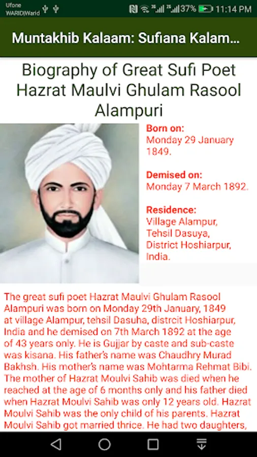 The great Sufi poet Hazrat Maulvi Ghulam Rasool Alampuri was born on Monday 29th January 1849 at village Alampur, tehsil Dasuha, district Hoshiarpur, India and he demised on 7th March 1892 at the age of 43 years only.He is Gujjar by caste and sub-caste was kisana. His father’s name was Chaudhry Murad Bakhsh. His mother’s name was Mohtarma Rehmat Bibi. The mother of Hazrat Maulvi Sahib has died when he reached at the age of 6 months only and his father died when Hazrat Moulvi Sahib was only 12 years old. Hazrat Maulvi Sahib was the only child of his parents. Hazrat Maulvi Sahib got married thrice. He had two daughters, Ayesha Bibi and Khadija Bibi. Sahibzada Masud Ahmed is a son of Razia Begum who is the maternal daughter of Hazrat Maulvi Sahib and Sahibzada Masud Ahmed is a maternal grandson of Hazrat Maulvi Sahib. He played a historical role and laid the foundation of Hazrat Maulvi Ghulam Rasool Alampuri Trust on Friday 30 November 1990. Two books of Sahibzada Masud Ahmed were published on life history and work of Hazrat Maulvi Sahib. The first book with the title of “Doonghey Raaz” (A study regarding Moulvi Ghulam Rasool Alampuri) was published in 1999. The book is included in the course of M.A level in Pakistan.His second book with the title of “Moulvi Ghulam Rasool Alampuri: Personality and Work” has published by the “Pakistan Academy of Letters” in 2011. The book named “Moulvi Ghulam Rasool Alampuri: Personality & Works” and the same was translated into Gurmukhi script by the “Language & Literature Department” Patiala, India and published it.The work of Hazrat Maulvi Ghulam Rasool Alampuri has also been included in the curriculum from matriculation to MA level in Pakistan. Two PhDs have also been completed on him. His available books are Daastan Ameer Hamza, Rooh ul Tarteel, Ahsan ul Qasas, Masla e Tauheed, Seeh Harfi Hulya Sharif (P.B.U.H), Chithian, Seeh Harfi Sassi Punnu, Chopat Nama, Pandh Nama and Maa’rb ul Khashien.