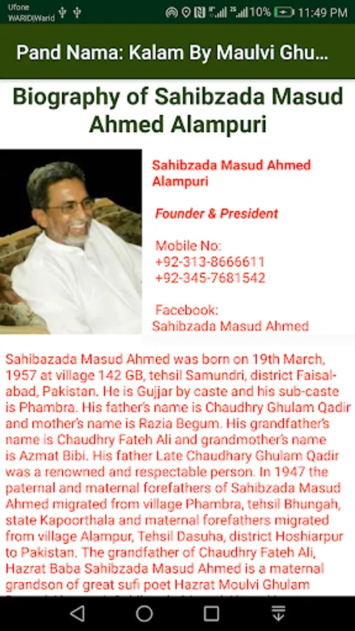 The great Sufi poet Hazrat Maulvi Ghulam Rasool Alampuri was born on Monday 29th January 1849 at village Alampur, tehsil Dasuha, district Hoshiarpur, India and he demised on 7th March 1892 at the age of 43 years only.He is Gujjar by caste and sub-caste was kisana. His father’s name was Chaudhry Murad Bakhsh. His mother’s name was Mohtarma Rehmat Bibi. The mother of Hazrat Moulvi Sahib has died when he reached at the age of 6 months only and his father died when Hazrat Moulvi Sahib was only 12 years old. Hazrat Moulvi Sahib was the only child of his parents. Hazrat Maulvi Sahib got married thrice. He had two daughters, Ayesha Bibi and Khadija Bibi. Sahibzada Masud Ahmed is a son of Razia Begum who is the maternal daughter of Hazrat Moulvi Sahib and Sahibzada Masud Ahmed is a maternal grandson of Hazrat Moulvi Sahib. He played an historical role and laid the foundation of Hazrat Maulvi Ghulam Rasool Alampuri Trust on Friday 30 November 1990. Two books of Sahibzada Masud Ahmed were published on life history and work of Hazrat Moulvi Sahib. First book with the title of “Doonghey Raaz” (A study regarding Moulvi Ghulam Rasool Alampuri) was published in 1999. The book is included in the course of M.A level in Pakistan.His second book with the title of “Moulvi Ghulam Rasool Alampuri: Personality and Work” has published by the “Pakistan Academy of Letters” in 2011. The book named “Moulvi Ghulam Rasool Alampuri: Personality & Works”and the same was translated into Gurmukhi script by the “Language & Literature Department” Patiala, India and published it.The work of Hazrat Moulvi Ghulam Rasool Alampuri has also been included in the curriculum from matriculation to MA level in Pakistan. Two Phds have also been completed on him. His available books are Daastan Ameer Hamza, Rooh ul Tarteel, Ahsan ul Qasas, Masla e Tauheed, Seeh Harfi Hulya Sharif (P.B.U.H), Chithian, Seeh Harfi Sassi Punnu, Chopat Nama, Pandh Nama and Maa’rb ul Khashien.