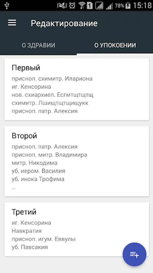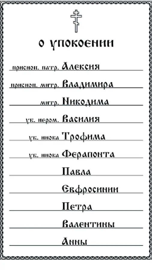The application allows you to conveniently organize and view a personal commemoration book (a set of memorial notes "On health" and "On repose") of an Orthodox Christian.