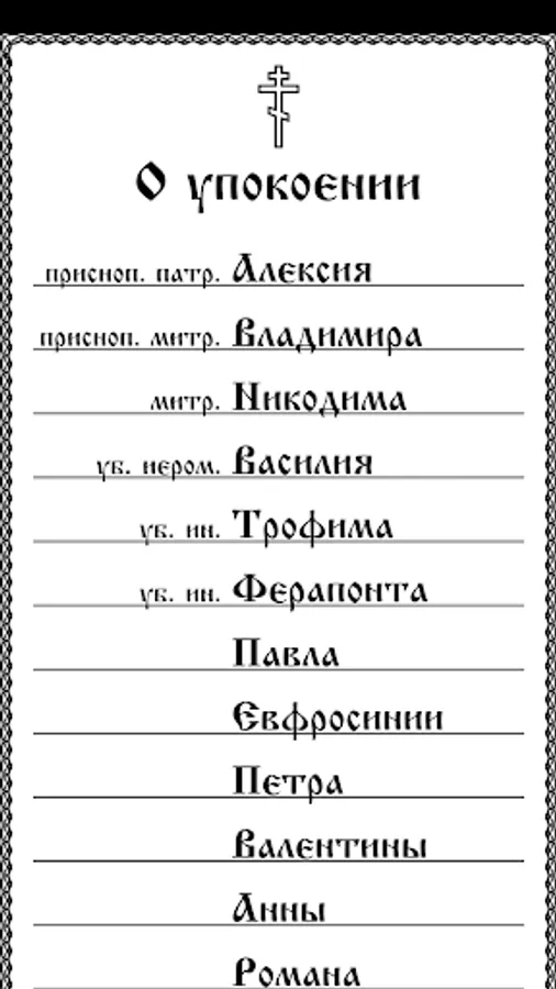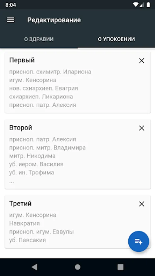 The application allows you to create and edit memorial notes "On health" and "On repose" in a convenient form. A commemoration book created in this way can be read daily when performing morning and evening prayer rules.