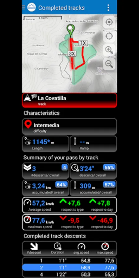 - Possibility to examine each descent, showing it on the map, with the route taken, tracks useds, and timing sectors