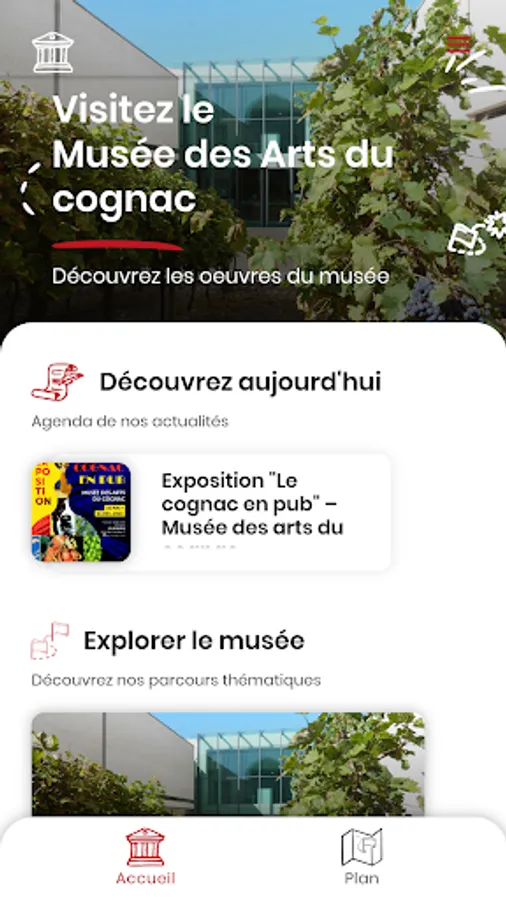 Designed by the teams of the Musée des Arts du Cognac in partnership with students and teachers from the University of La Rochelle and with the support of the DRAC Nouvelle-Aquitaine, this application offers an intuitive menu very easy to use, within reach of all. From the menu, the visitor navigates on different tabs.