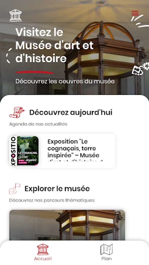 Designed by the teams of the Museum of Art and History of Cognac in partnership with students and teachers from the University of La Rochelle and with the support of the DRAC Nouvelle-Aquitaine, this application offers a very simple intuitive menu of use, accessible to all. From the menu, the visitor navigates on different tabs.