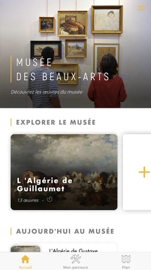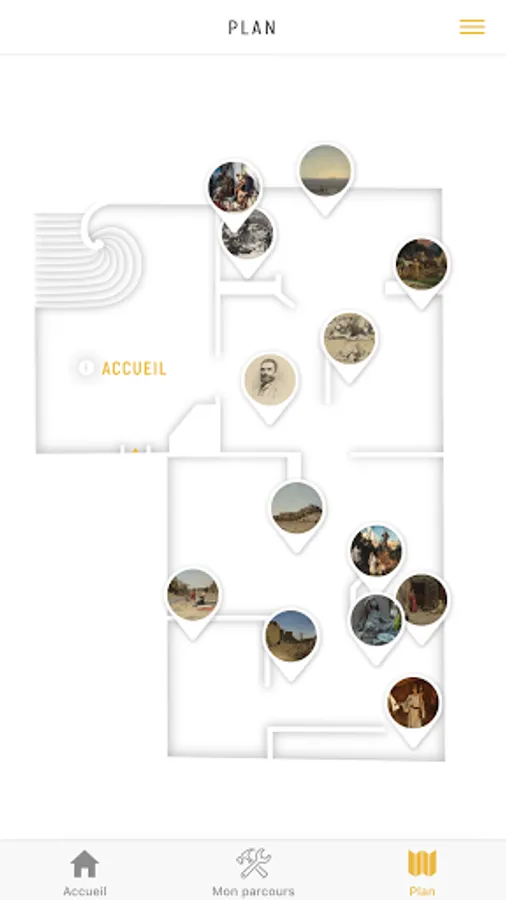 Designed by the teams of the Musée des Beaux-Arts de La Rochelle in partnership with students and teachers from the University of La Rochelle and with the support of the DRAC Nouvelle-Aquitaine, this application offers an intuitive menu that is very easy to use, to everyone. From the menu, the visitor navigates on different tabs. A map of the museum showing 22 emblematic works allows you to find your way around the maze of rooms, in association with iBeacons, sensors using Bluetooth technology.