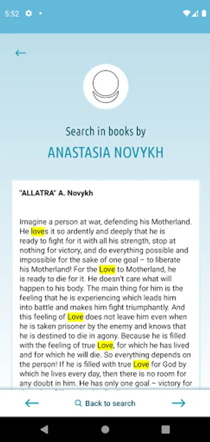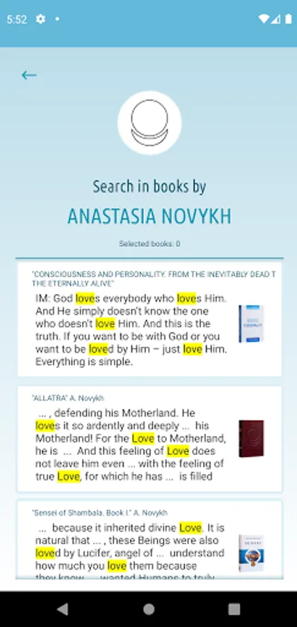 KnowMuch app allows user to search in books by Anastasia Novykh and in videos with participation of Igor Mikhalovich Danilov. Search results can be narrowed down by using filters (either specific book or video). Searching books is currently available in English, Russian, Czech, Polish and Ukrainian. New languages will be added once translations are ready. Searching videos is available in many languages and new ones will be added once a translation is available. Results of a videos search returns short text and link to exact timeframe of video on youtube which is very convenient and user can jump directly to watching it from there. The user can also apply a video filter which narrows down search results. This allows one to quickly share the exact minute of the video.