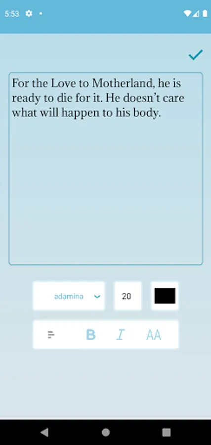 Application offers possibility to mark text in search results and store it internally in a local quote database, share it on social media, or create beautiful motivators. Thanks to storing quotes functionality, you can always return to your marked texts/quotes and share them even quicker! There is an option to search among them so do not worry about storing too many texts/phrases/quotes! You will always be able to search for what you have stored. App has a built-in editor/creator of motivational pictures with combination of phrases and quotes from the books. It offers user a wide variety of backgrounds and fonts to create wonderful motivational pictures and allows one to save them in the pictures folder.