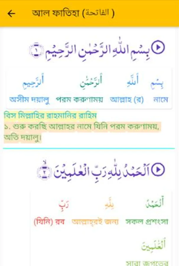 Play option for single Ayat/multi Ayat with Bangla meaning or without Bangla meaning.