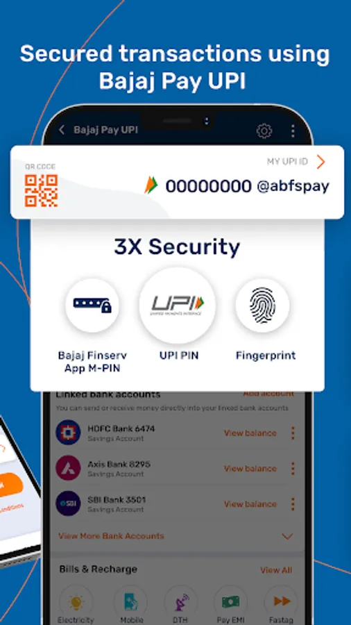 • Create your unique Bajaj Pay UPI ID & send/receive money or pay bills by scanning any QR code.