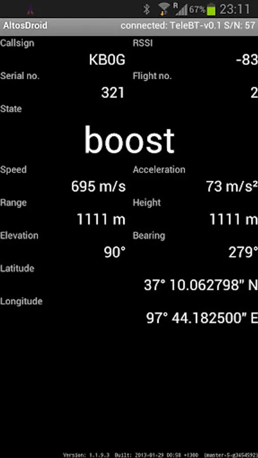 Using TeleBT ground station hardware, AltosDroid is able to receive telemetry from your Altus Metrum flight computer.
