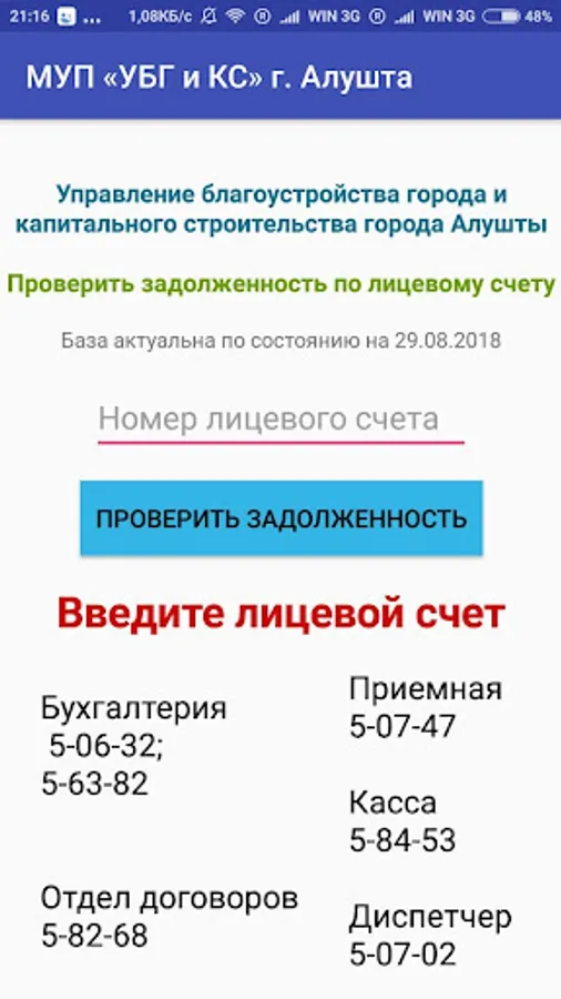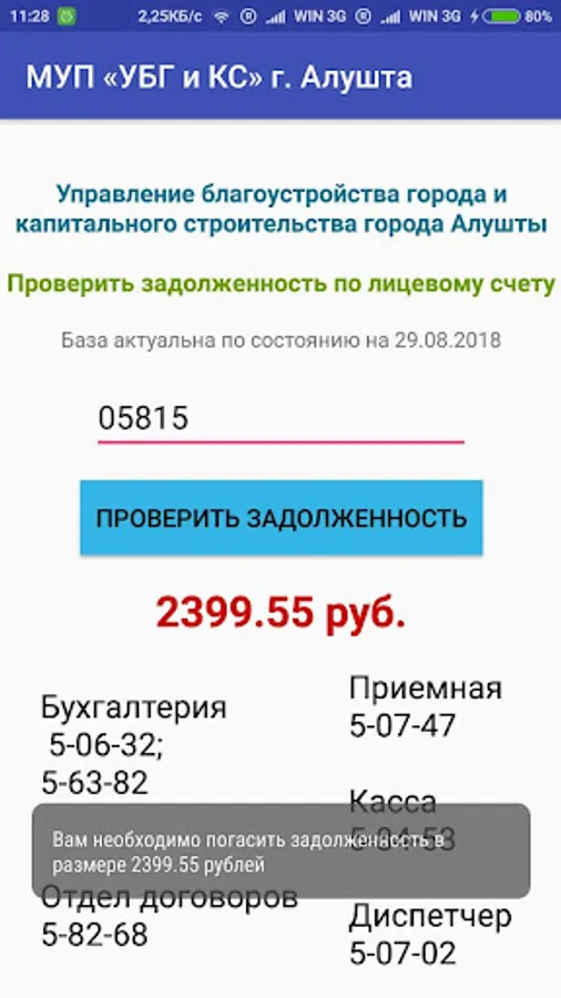 Verification of the debt to the municipal unitary enterprise for the management of city improvement and capital construction of the city of Alushta, as well as contact telephones.