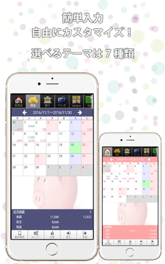 シンプルなお小遣い帳としての利用から、現金・預金・クレジット、電子マネーなどの本格的な資産(帳簿)管理まで幅広い用途に対応。