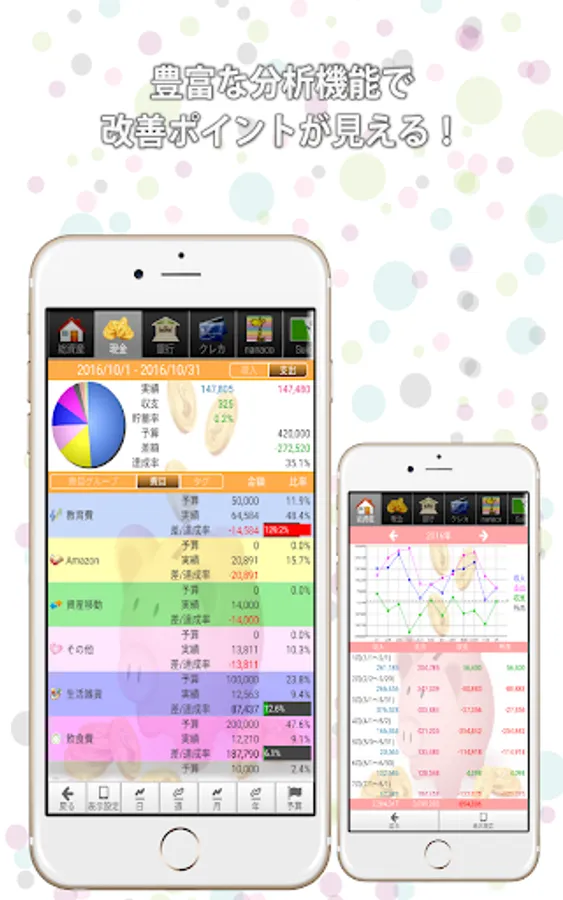 ・費用別や月間、年間、週間のグラフィカルな分析が可能で、残額もひと目で確認できます。