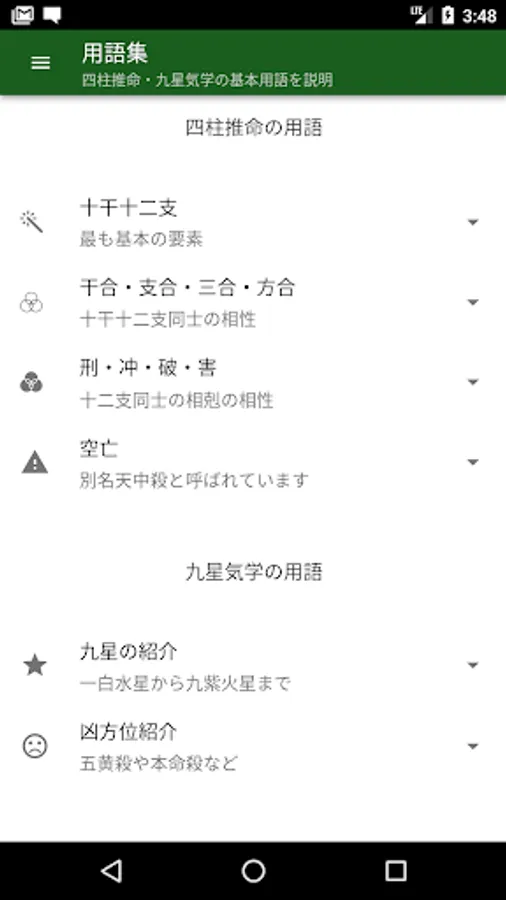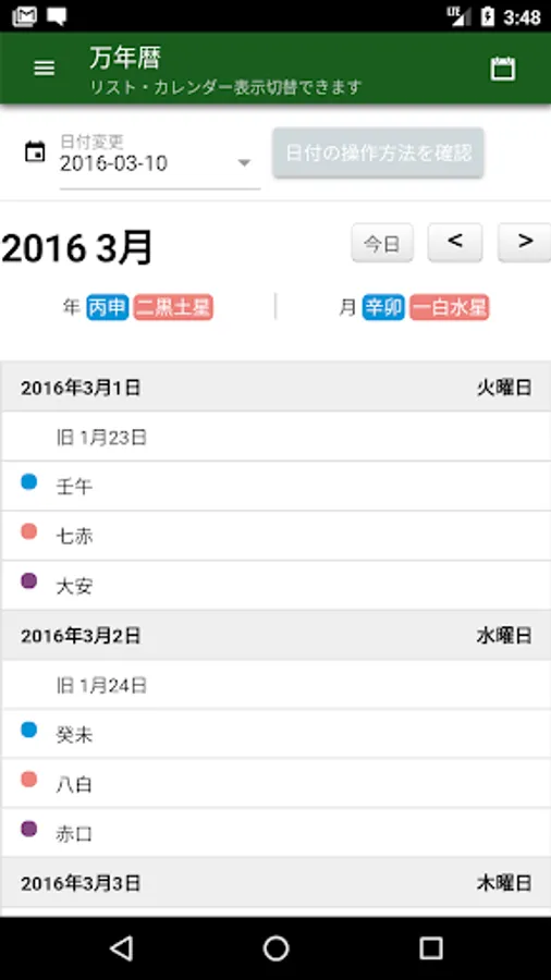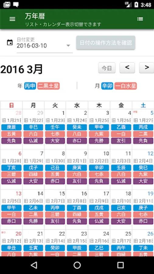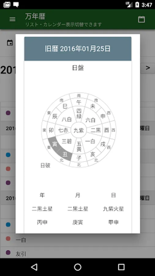 干支、九星、六曜、二十四節気を表示したシンプルな万年暦になります。旧暦の範囲は1930年1月〜2060月12月までをカバーしていますので重い万年暦を普段から持ち歩きたくなくてもサクッとこのアプリで調べられます。占いをやる方、旧暦や九星を確認したい方にオススメです。