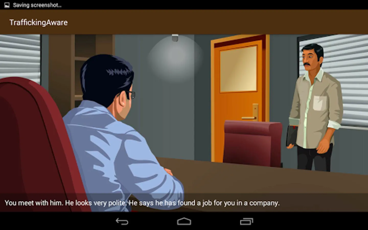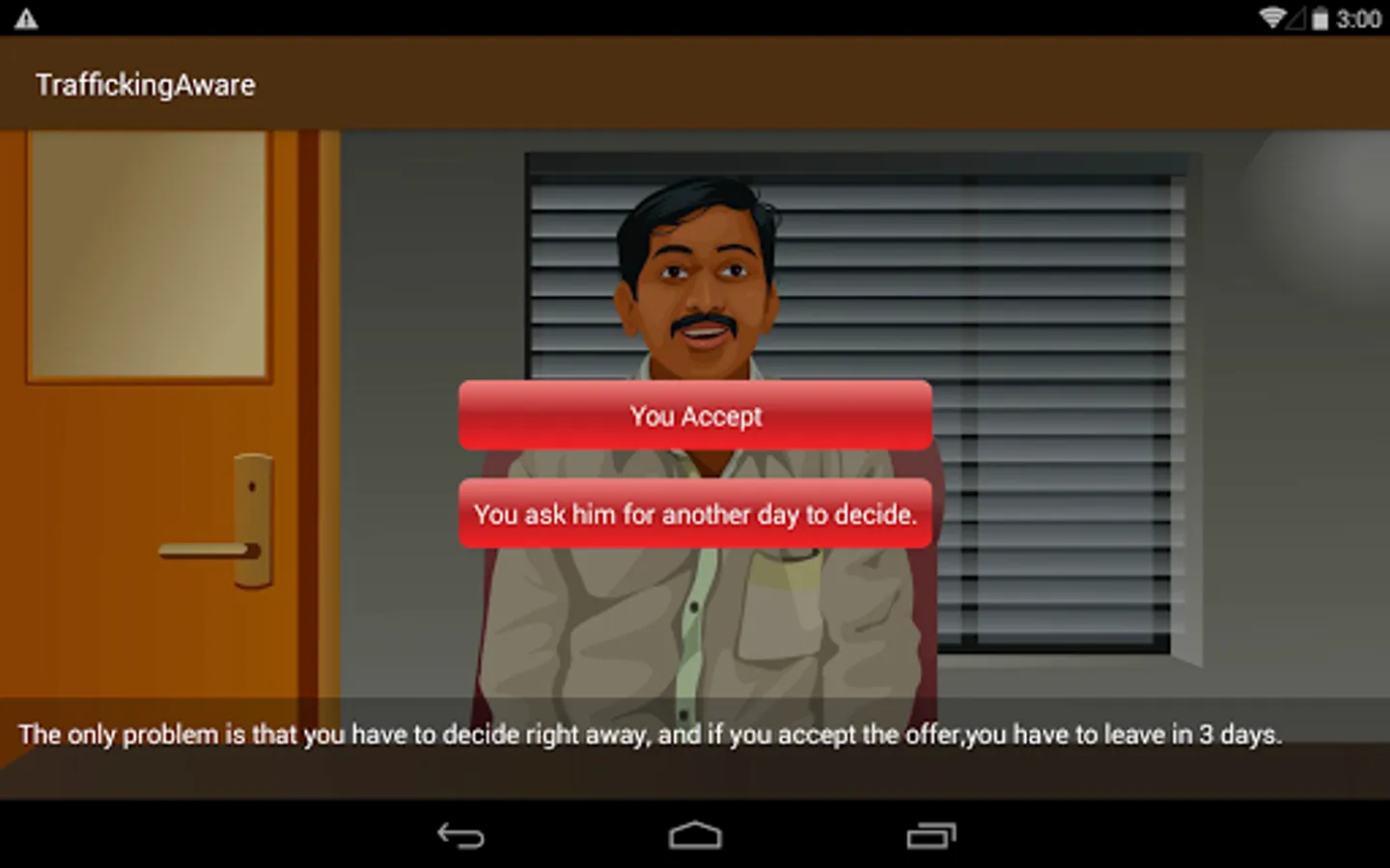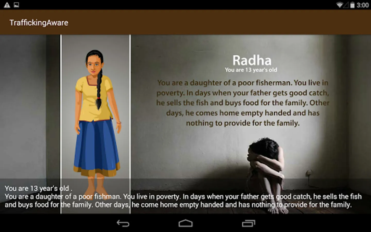 “TraffickingAware” is designed to educate users about the different types of human trafficking and prevention of its crimes. This interactive game acquaints people with the various kinds and stages of trafficking- from recruitment to exploitation to escape. The app presents different scenarios in real life, leading one from recognizing types of trafficking, facing the virtual consequences of one’s choices, and showing how those choices can be avoided. Familiarizing users with potential dangers, the app enables them to recognize similar situations in everyday life and protect themselves and people around them.