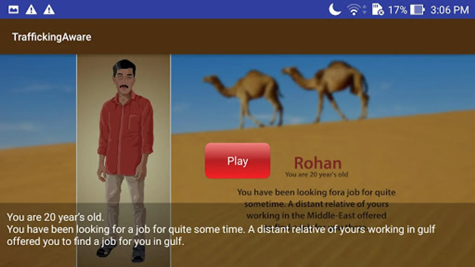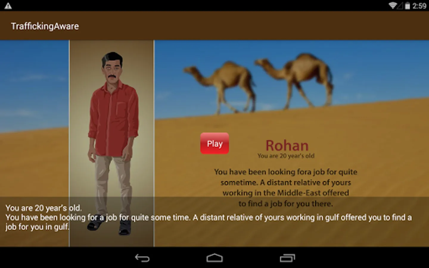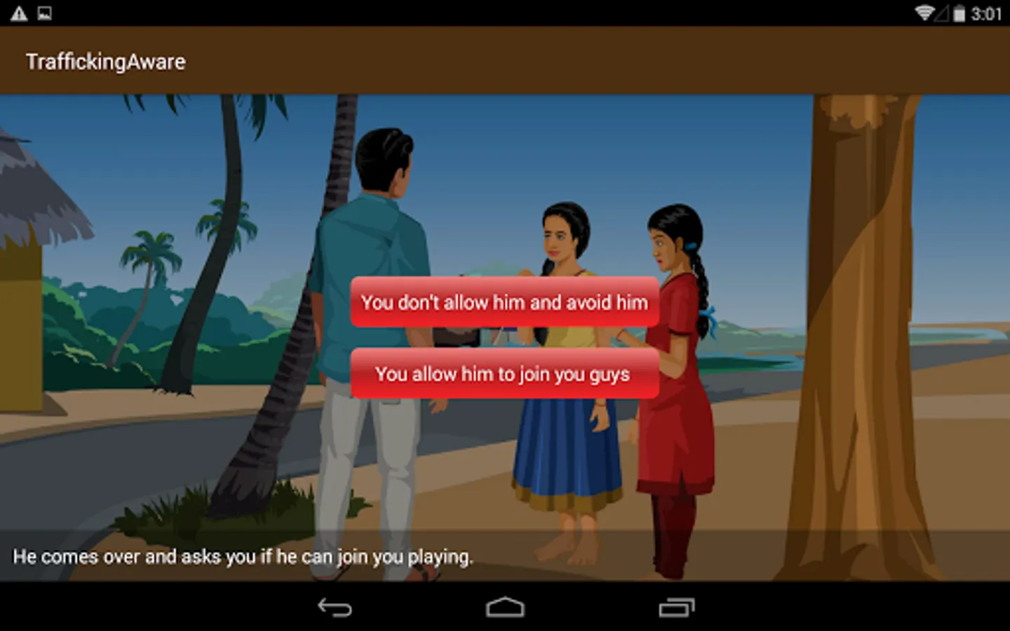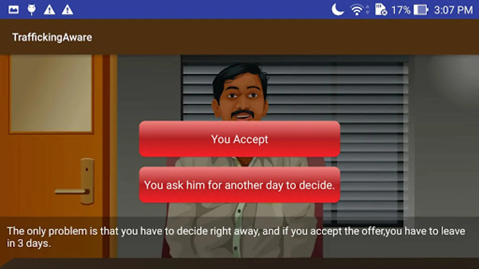 “TraffickingAware” is designed to educate users about the different types of human trafficking and prevention of its crimes. This interactive game acquaints people with the various kinds and stages of trafficking- from recruitment to exploitation to escape. The app presents different scenarios in real life, leading one from recognizing types of trafficking, facing the virtual consequences of one’s choices, and showing how those choices can be avoided. Familiarizing users with potential dangers, the app enables them to recognize similar situations in everyday life and protect themselves and people around them.