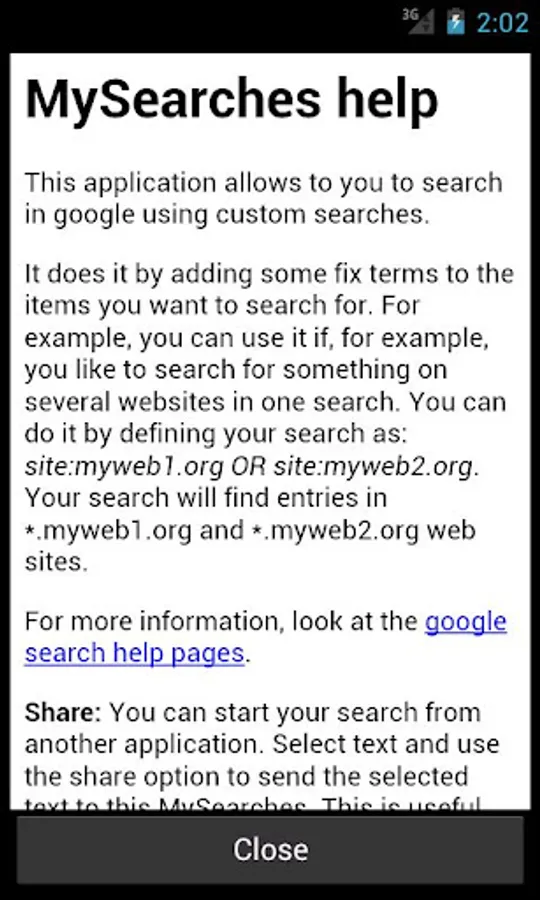 You can start your search from another application. Select text and use the "share" option to send the selected text to this MySearches.